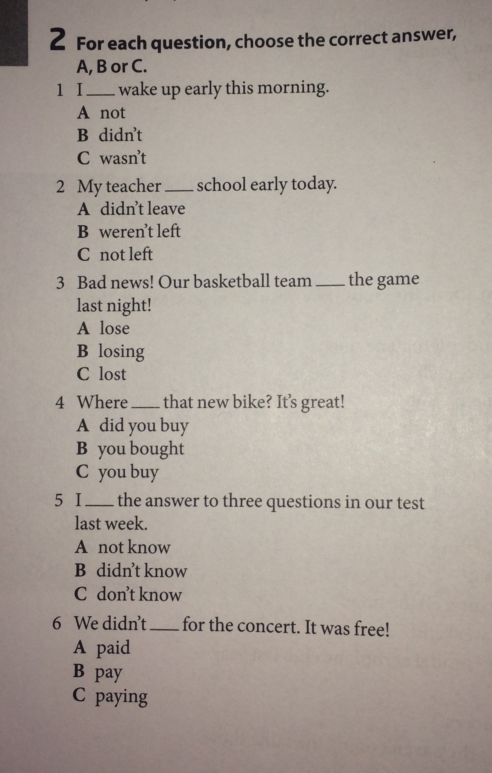 1 not 2 not left 3 lost 4 you bought 5 didnt know 6 pay