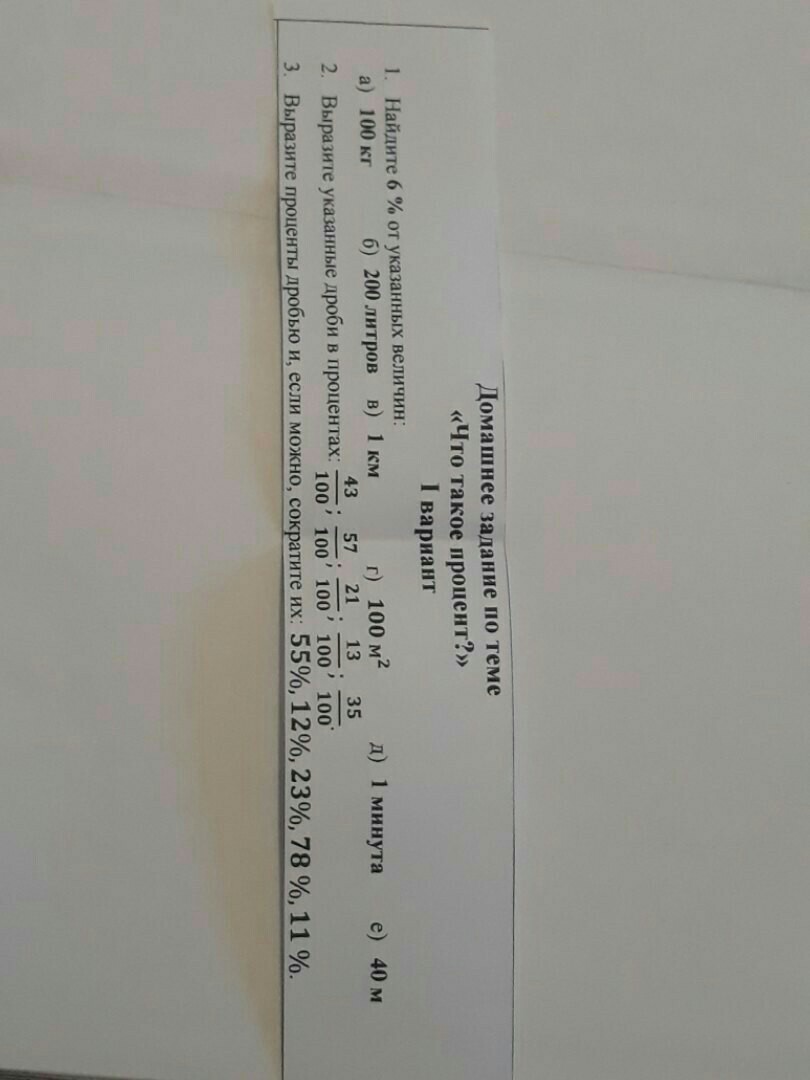 По-гречески "про-цент" означает "сотая часть", т.е. 1%=1/100, тогда: 1. 6%=6/100, а) 100кг*6/100= 6кг б) 200л*6/100= 12л, в) 1км=1000м*6/100= 60м, г) 100м²*6/100=? 6м², д) 1мин= 60сек*6/100= 3.6сек, е) 40м*6/100= 2.4м 2. (43/100)*100%= 43%, 57/100*100%= 57%, 21*100%/100= 21%, 13%, 35% 3. 55%=55*1%=55/100=11/20, 12%=12/100=3/25, 23%=23/100, 78%=78/100=39/50, 11%=11/100