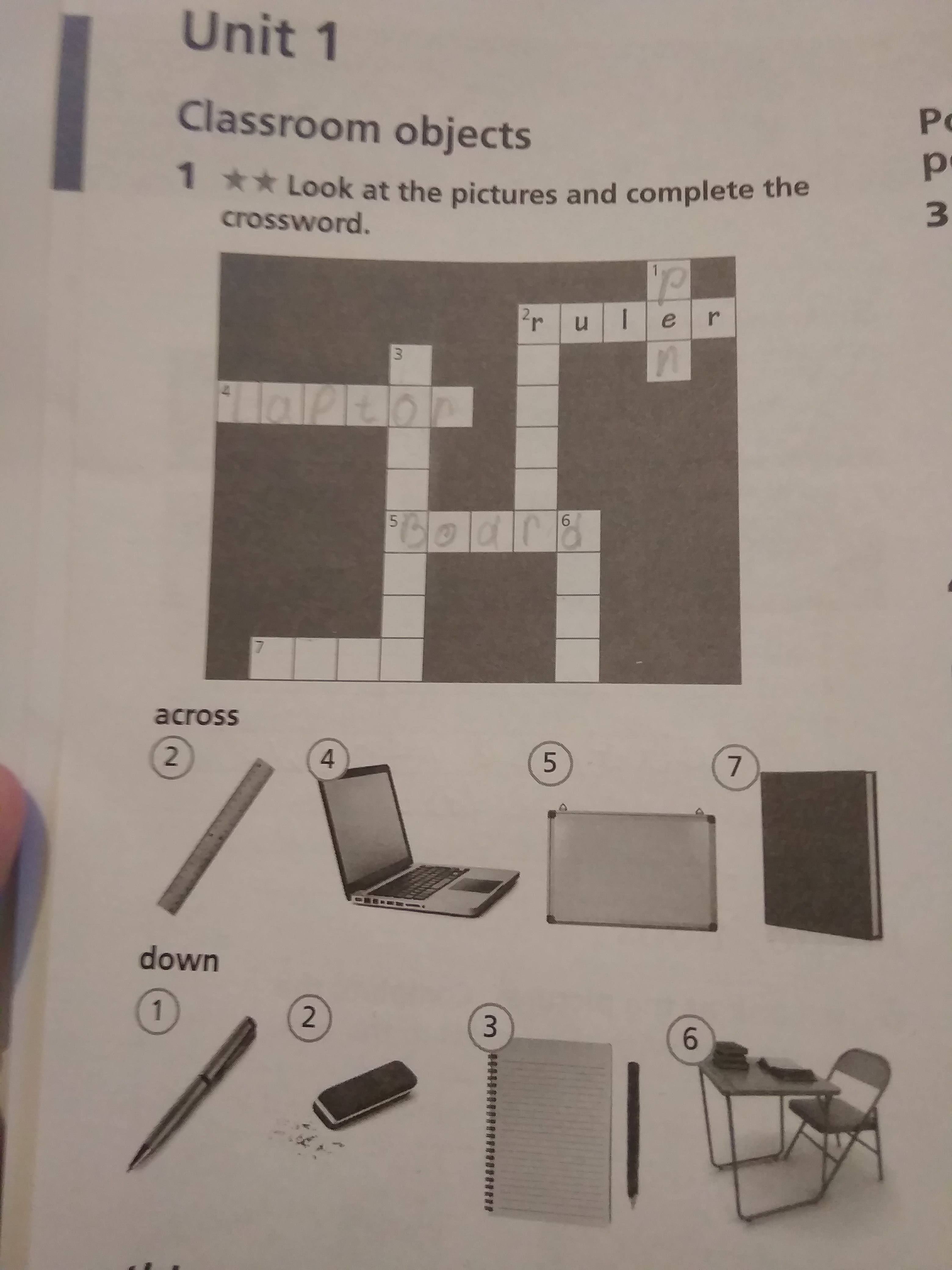 2. ruler, 3. copybook 6. desk, 7 book