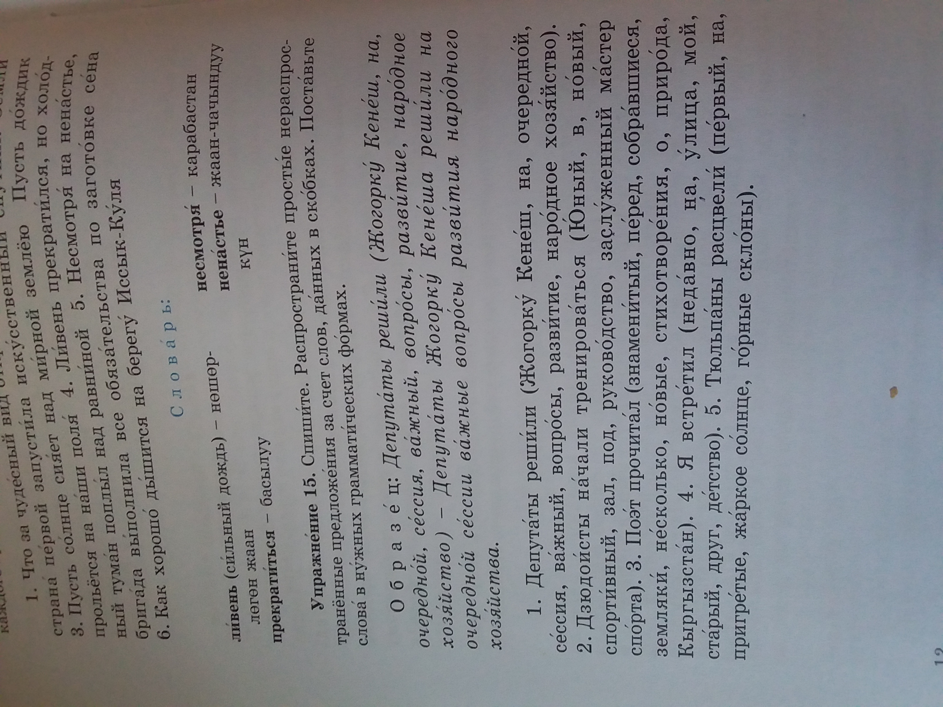 2.Юные дзюдоисты начали тренироваться в новом спортивном зале под руководством заслуженного мастера спорта. 3.Знаменитый поэт прочитал перед собравшимися земляками несколько новых стихотворений о природе Кыргызстана. 4. Недавно я встретил на улице моего старого друга детства. 5. Первые тюльпаны расцвели на пригретых жарким солнцем горных склонах.