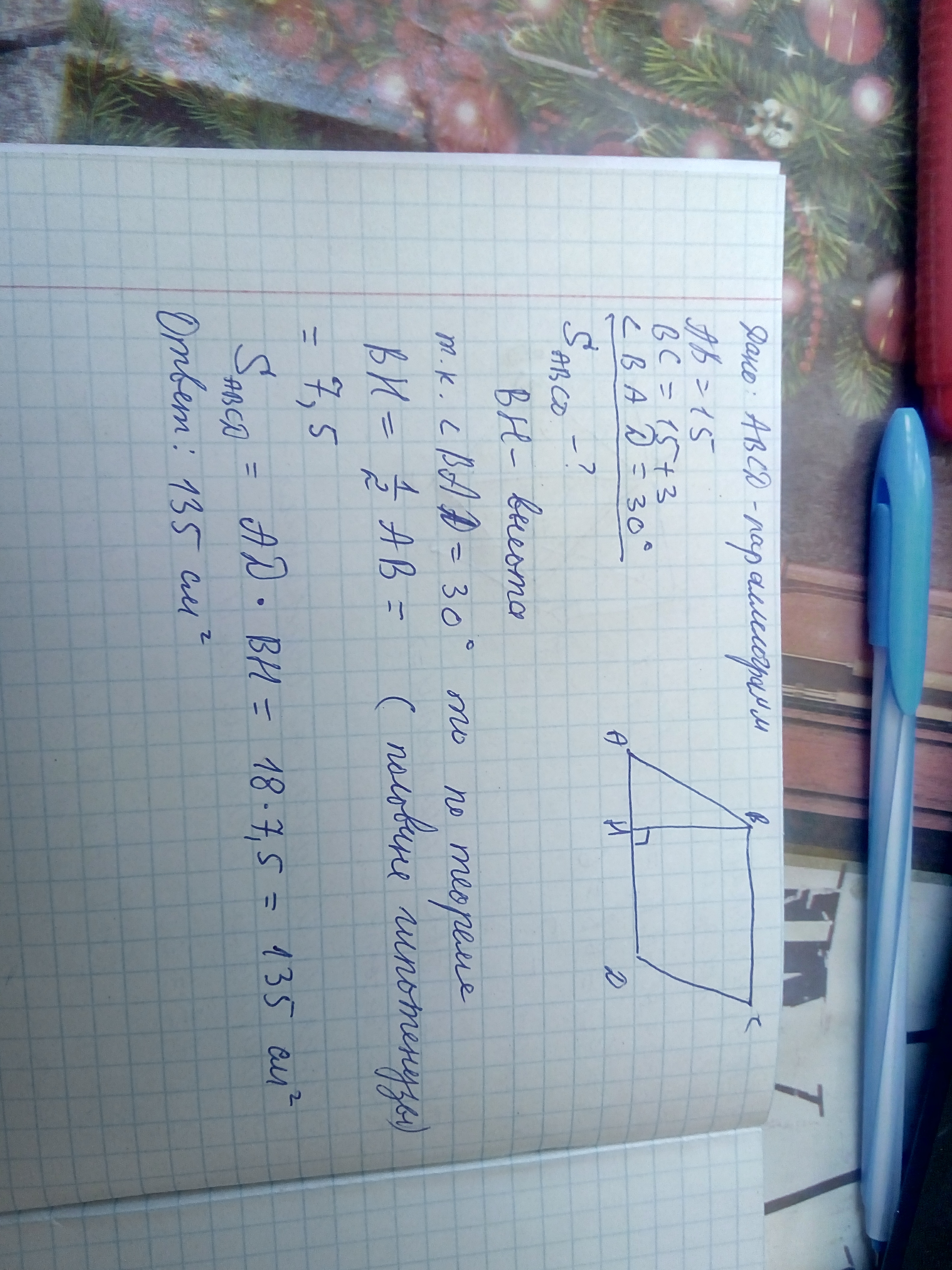 Или по формуле S=absina= 15*18*0.5=135 Площадь параллелограмма равна произведению двух его сторон на синус угла между ними