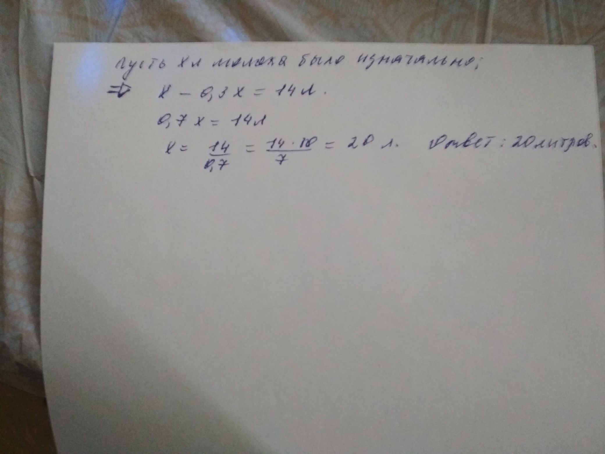 После того как из бидона отлили 30%молока в нём осталось 14л.Сколько литров молока было в бидона первоначально? Помагите пожалуйста!!! Пожалуйста