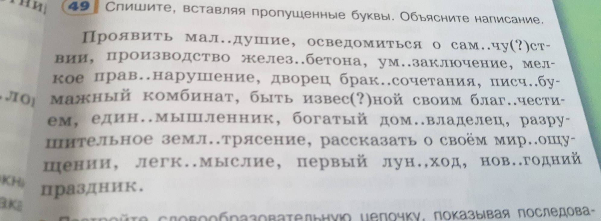 проявить малодушие, осведомиться о самочувствии, производство железобетона, умозаключение, мелкое правонарушение, дворец бракосочетания, писчей бумажный комбинат, быть известной своим благочестием, единомышленник, богатый домовладелец, разрушительное землятресение, рассказать о своём мироощущении, легкомыслие, первый луноход, новогодний праздник.