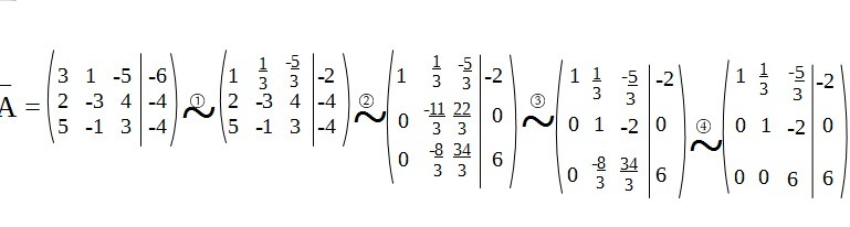 2)Прибавляем ко 2 строке 1 строку умноженную на (-2). Прибавляем к 3 строке 1 строку умноженную на (-5).