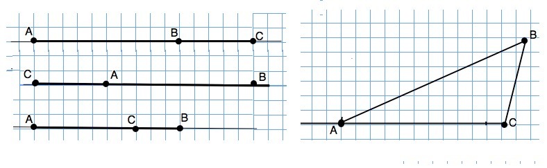 Могут ли A, B, C принадлежать одной прямой, если длина большлго отрезка AB меньше суммы длин отрезков AC и BC