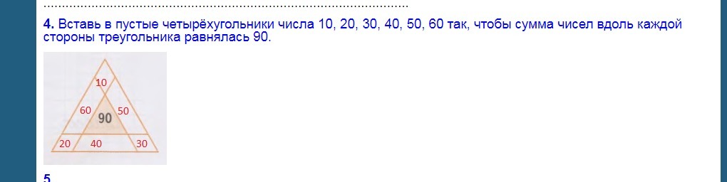 Вставь в пустые четырёхугольники числа 10,20,30,40,50,60 так, чтобы сумма чисел вдоль каждой стороны треугольника равнялось 90.