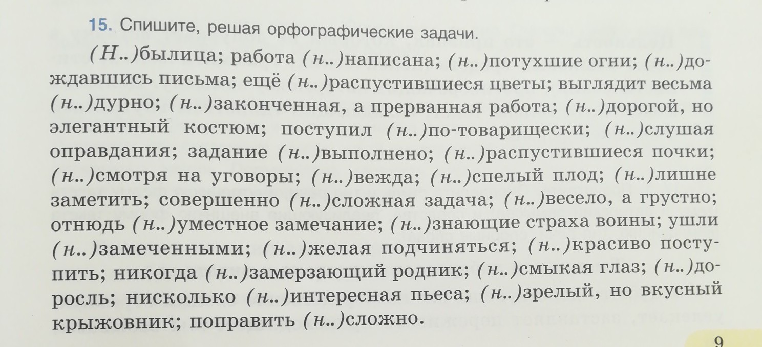 НЕбылица; работа НЕ написана; НЕпотухшие огни; НЕ дождавшись письма; еще НЕ распустившиеся цветы; выглядит весьма НЕдурно; НЕ законченная, а прерванная работа; НЕдорогой, но элегантный костюм; поступил НЕ по-товарищески; НЕ слушая оправдания; задание НЕ выполнено; НЕраспустившиеся почки; НЕсмотря на уговоры; НЕвежда; НЕспелый плод; НЕлишне заметить; совершенно НЕсложная задача; НЕ весело, а грустно; отнюдь НЕуместное замечание; НЕ знающие страха воины; ушли НЕзамеченными; НЕ желая подчиняться; НЕкрасиво поступить; никогда НЕ замерзающий родник; НЕ смыкая глаз; НЕдоросль; нисколько НЕ интересная пьеса; НЕзрелый, но вкусный крыжовник; поправить НЕсложно.