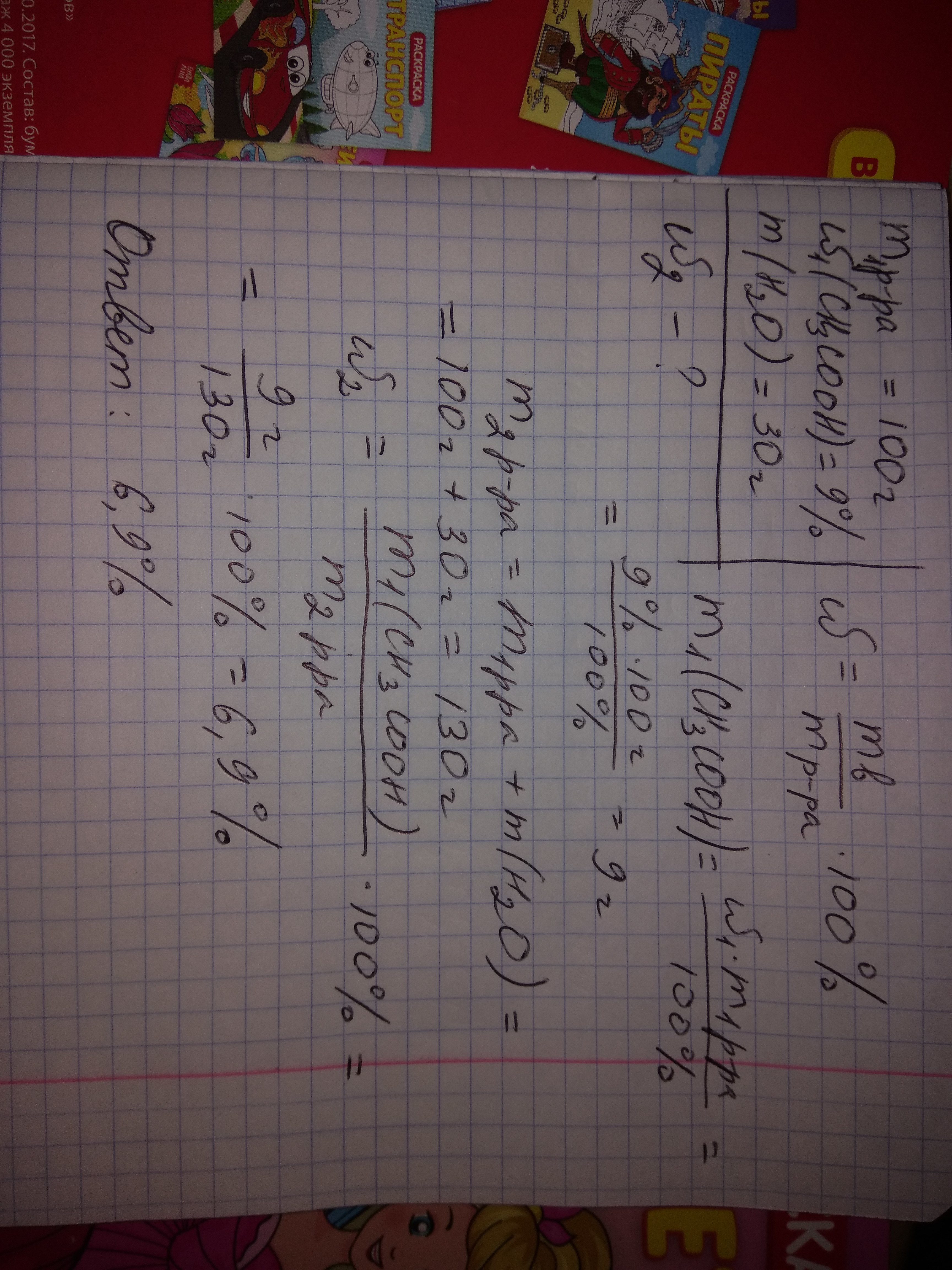 Для изготовления заправки салата к 100 г раствора уксусной кислоты с массовой долей растворенного вещества 9% добавили 30 г воды. Вычислите массовую долю кислоты в образованном растворе, при условии, что плотность первого и второго раствора составляет 1 г / мл.