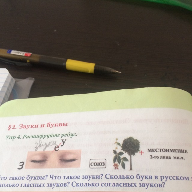 1) З + веки Вместо е записано у Получили ЗВУКИ. 2) СОЮЗ И. 3) БУК (дерево) + местоимение Вы. Получаем "ЗВУКИ И БУКВЫ".