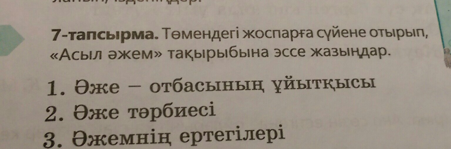 Әже -отбасының ұйытқысы.Әжеміз өз немерелерін жанындай жасы көреді, еркелетеді.Әженің тәрбиесі ерекше.Ол әрдайы тәриелі, инабатты, сыпайы, үлкенді құрметеуге үйретеді.Әжем маған ертегілер көп айтады.Оның маған ең алғаш айтқан ертегісі "Бауырсақ" ертегісі болатын.Ол маған өте қатты ұнаған болатын.