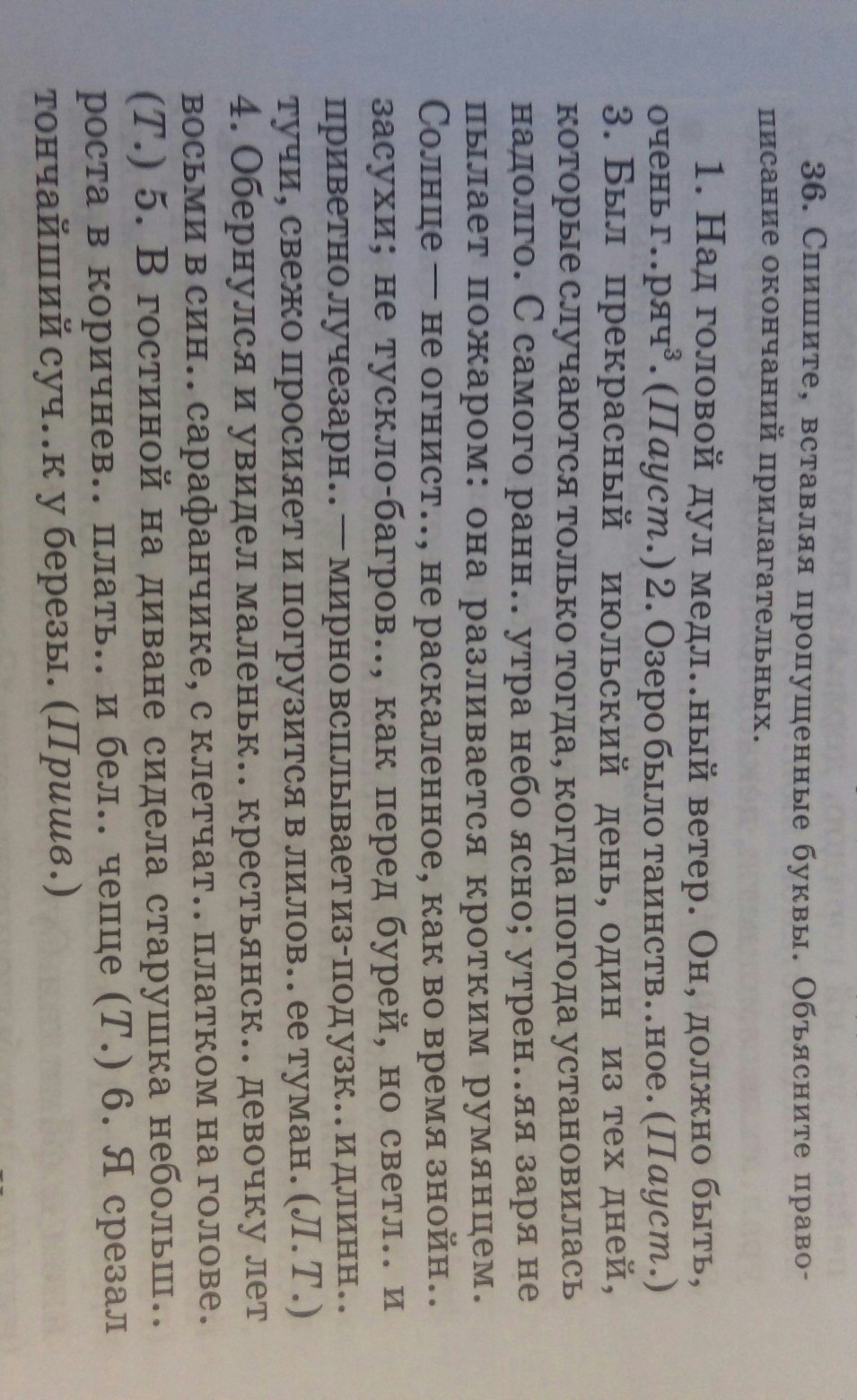 Над головой дул медленный ветер. Он, должно быть, очень горяч. Озеро было таинственное. С самого раннего утра небо ясно. Утренняя заря не пылает пожаром. Солнце - не огнистое, не раскаленное, как во время знойной засухи. Не тускло багровое, как перед бурей. Но светлое и приветно лучезарное - мирно всплывает из-под узкой и длинной тучи, свежо просияет и погрузится в лиловый ее туман. Обернулся и увидел маленькую крестьянскую девочку лет восьми в синем сарафанчике, с клетчатым платком на голове. В гостиной на диване сидела старушка небольшого роста в коричневом платье и белом чепце. Я срезал тончайший сучок у берёзы.