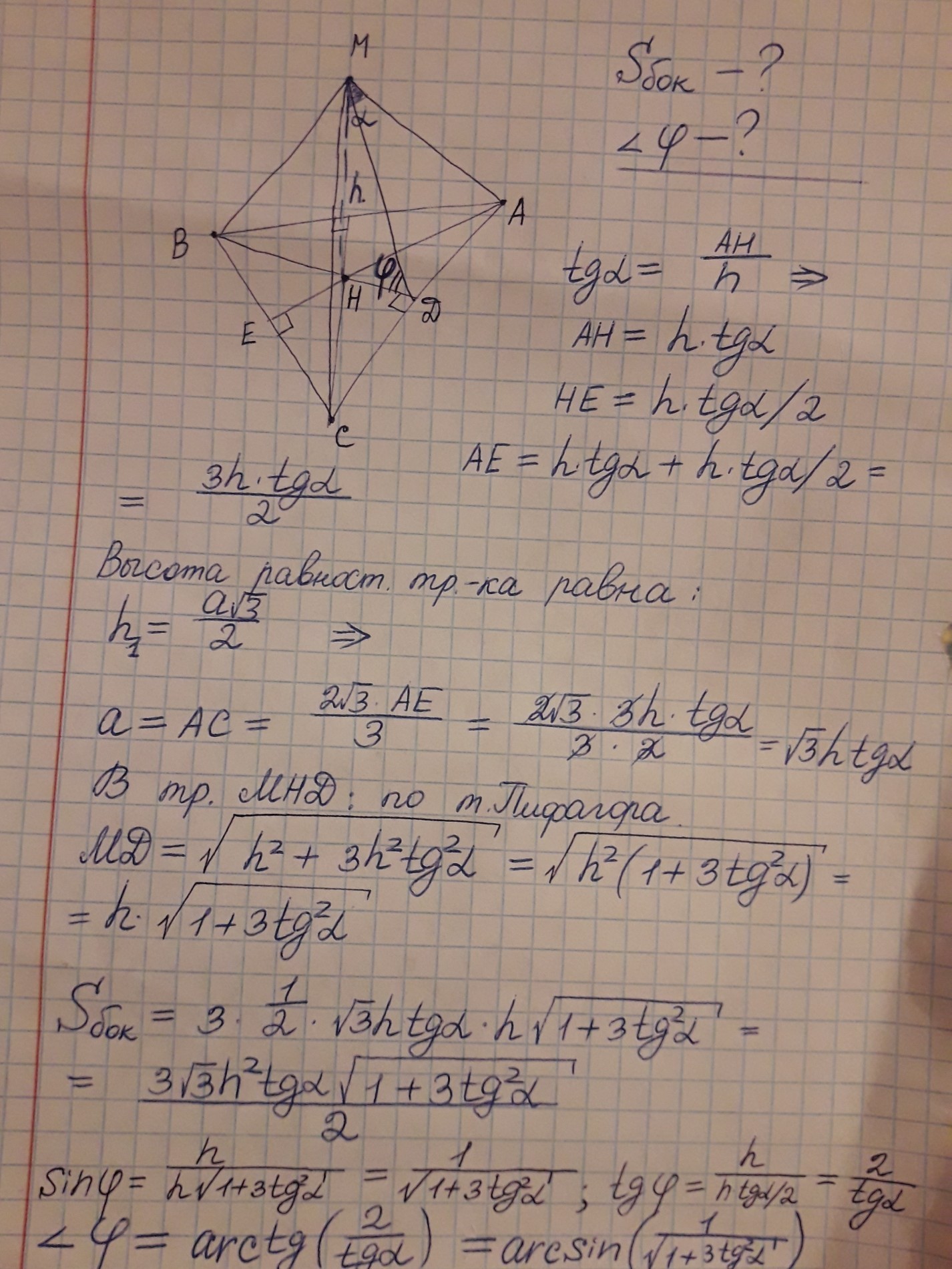 2. Высота правильной треугольной пирамиды равна н, а боковое ребро образует с высотой пирамиды угол альфа.Найти Sб. и угол наклонной боковой грани.