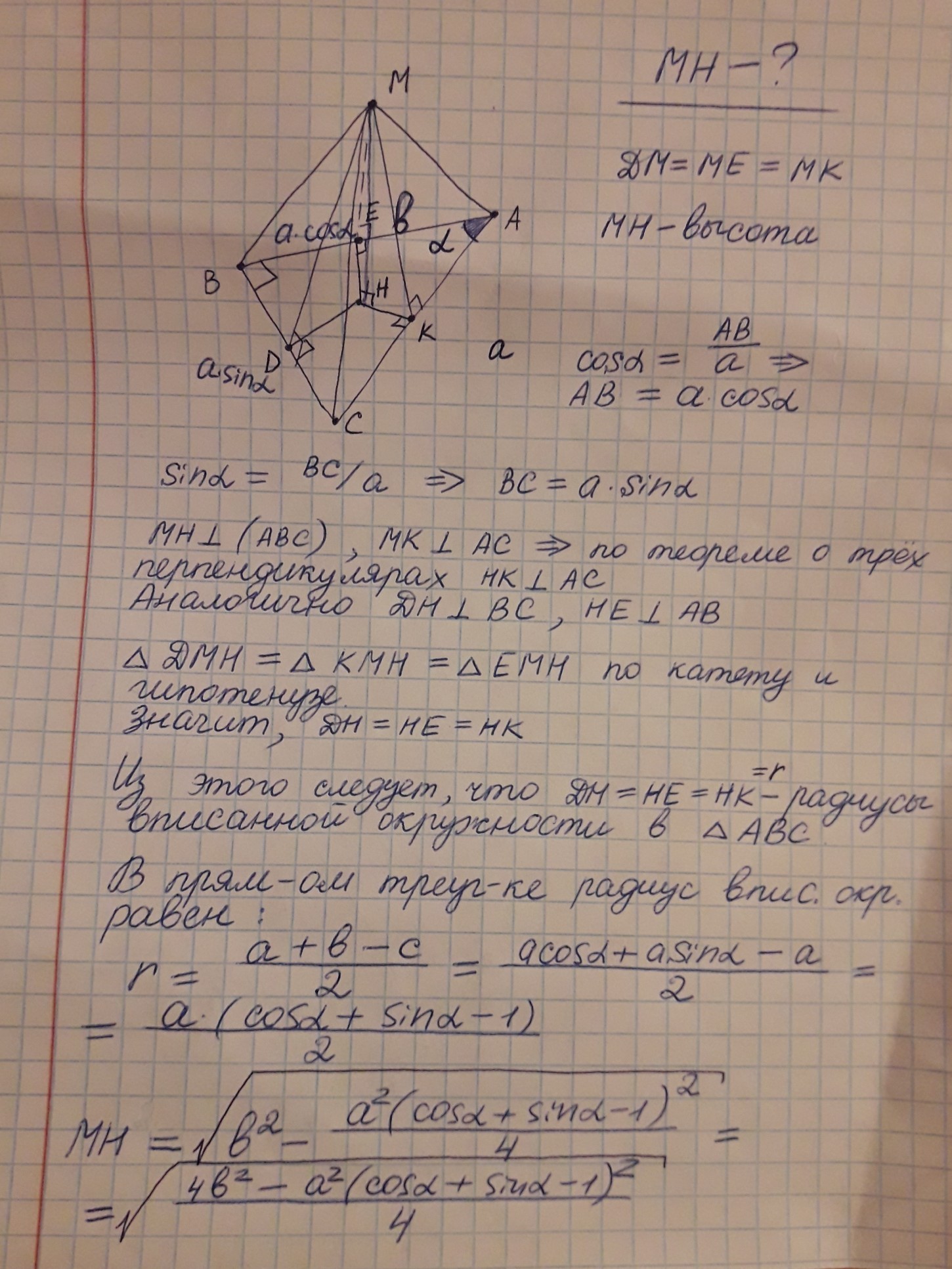 в трикгольнике АВС уголВ=90 , АС=а, угол А=альфа Точка М равноудалена от всех сторон треугольника АВС на расстоянии в найти расстояние от М до плоскости треугольника АВС