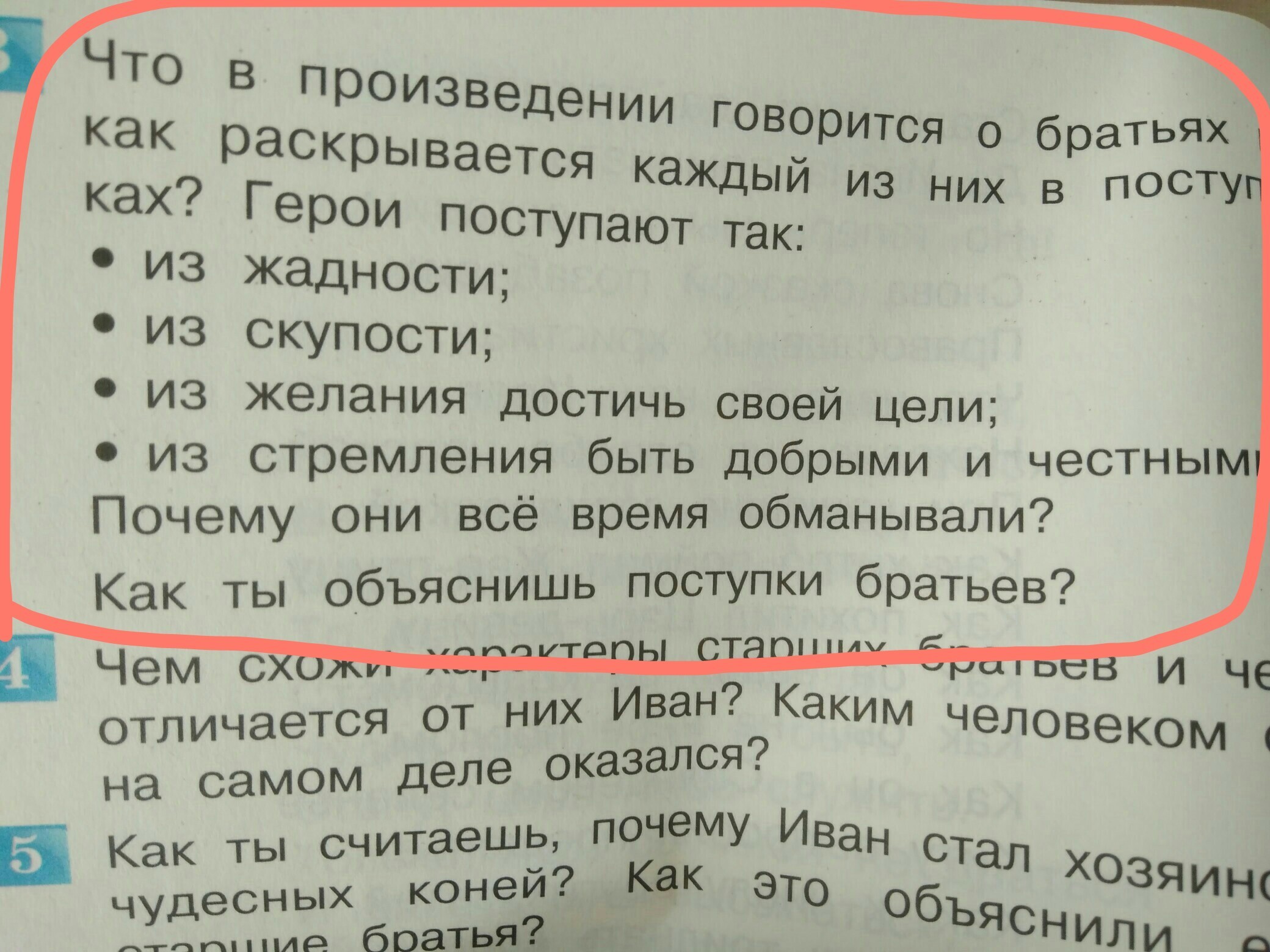 Третья ложь звучик, когда братьев нагоняет Иван. Они объясняли брату, что продают коней, дабы нужда не застала их в голодный год и на прокорм старика-отца, а в подарок обещают шапку красную и сапоги. Тут изворотливость и лживые оправдания.