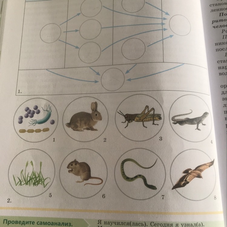 Моделирование «Построение пищевой сети». 1.В тетради дополните схему пищевой сети ,поместив в кружки номера изображённых организмов ,поедающих друг друга .На этих же примерах постройте 2 пищевые цепи .2.Цифрами постройте последовательность звеньев двух пищевых цепей .