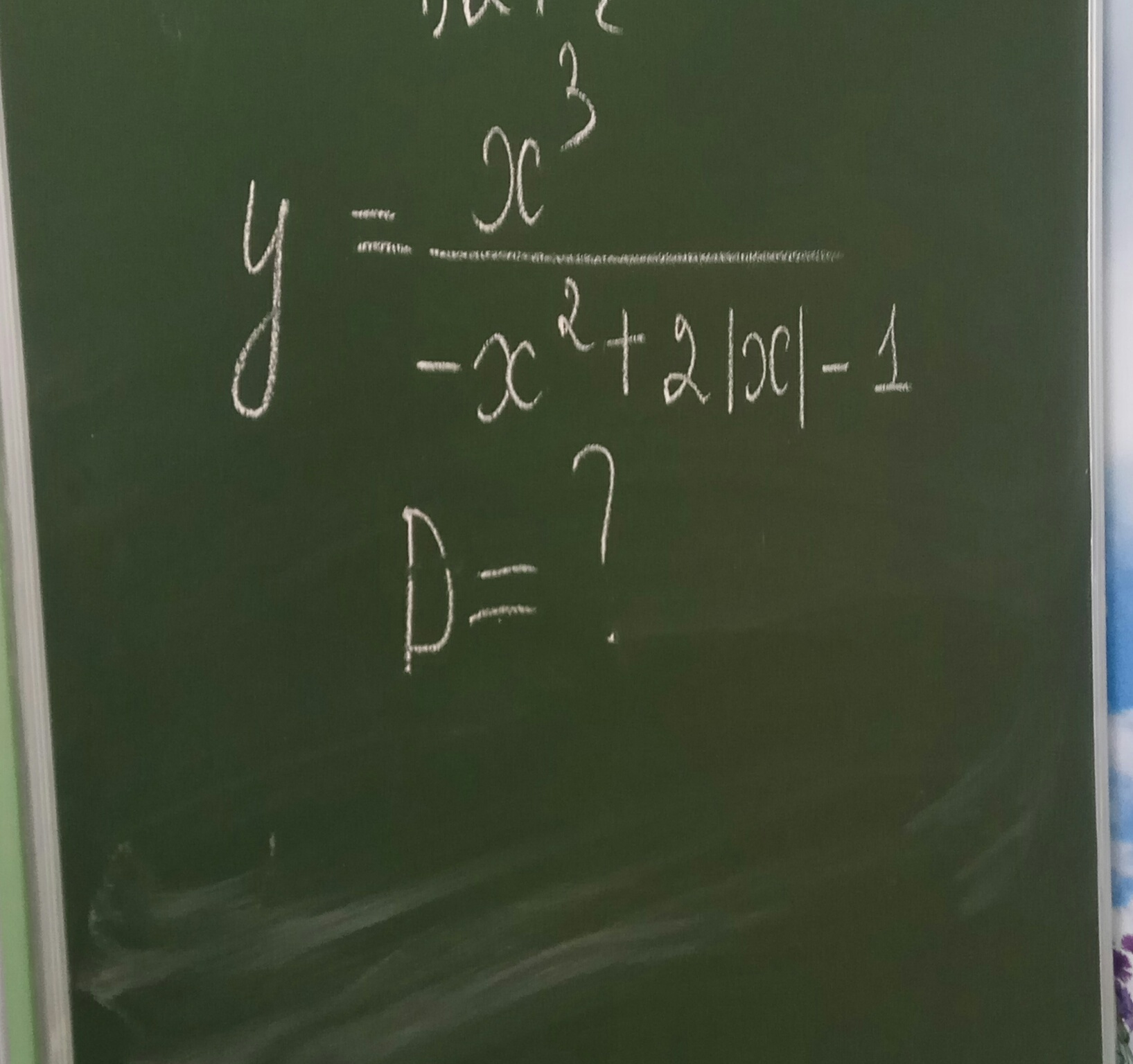 y=frac{x^3}{-x^2+2|x|-1}\\OOF:; ; -x^2+2|x|-1ne 0; ; Rightarrow ; ; -(x^2-2|x|+1)ne 0; ,\\x^2-2|x|+1ne 0; ,\\x^2=|x|^2; ,; ; |x|^2-2|x|+1=(|x|-1)^2ne 0; Rightarrow ; ; |x|-1ne 0; ,\\|x|ne 1; ; Rightarrow ; ; xne -1; ; i; ; xne 1\\D(y)=(-infty ,-1)cup (-1,1)cup (1,+infty )