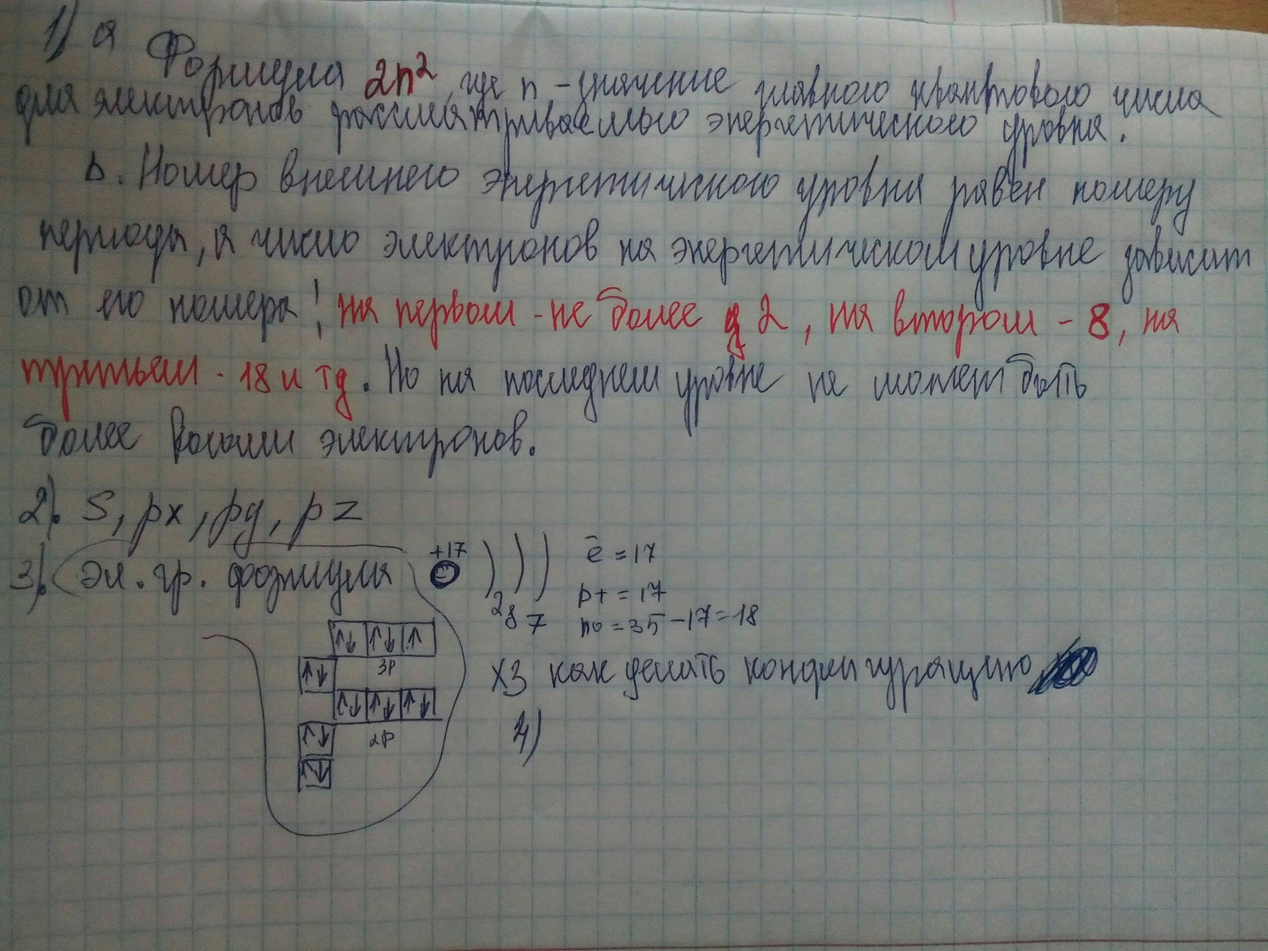 1. Электроны в атоме образуют электронные слои (или энергетические уровни). (а) Запишите формулу расчёта ёмкости каждого слоя. ______________________________________________________________________________ (b) Подсчитайте, сколько электронов может находиться на первом слое ________________________________________________________________ на третьем слое _______________________________________________________________ на четвёртом слое _____________________________________________________________ 2. Напишите названия электронных орбиталей. … — орбиталь … — орбиталь … — орбиталь … — орбиталь 3. Запишите электронную конфигурацию и электронно-графическую формулу атома, ядро которого имеет заряд +17. электронная конфигурация: _____________________________________________________ электронно-графическая формула: 4. Напишите электронные конфигурации ионов, в которые превращаются (а) атомы кислорода при присоединении двух электронов; (b) атомы бериллия при отдаче двух электронов. 5. Составьте формулы хлорида натрия и оксида лития методом «нулевой суммы». (а) хлорид натрия ____________________________________________________ (b) оксид лития ______________________________________________________