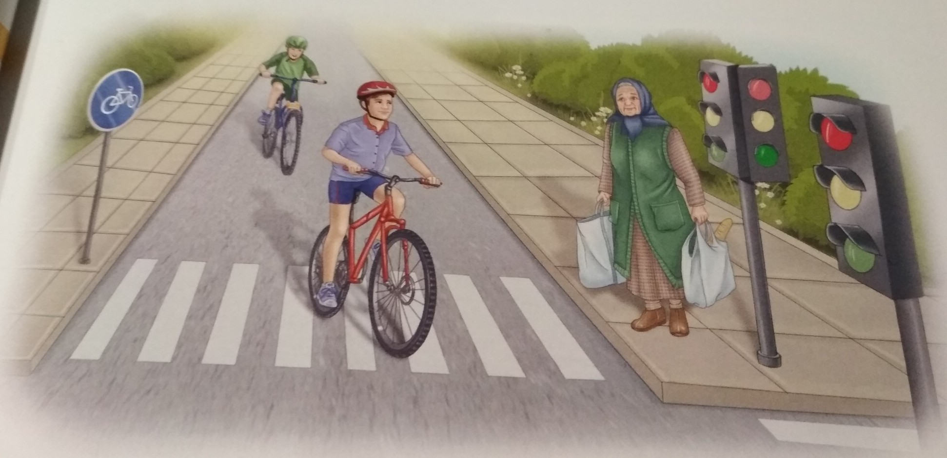 На дворе лето . Два друга катаются на велосипедах по велосипедной дорожке. Мальчики заботиться о своей безопасности и одели каски .Бабушка возвращается с магазина домой.Она стоит перед пешеходным переходом и уступает велосипедистам.