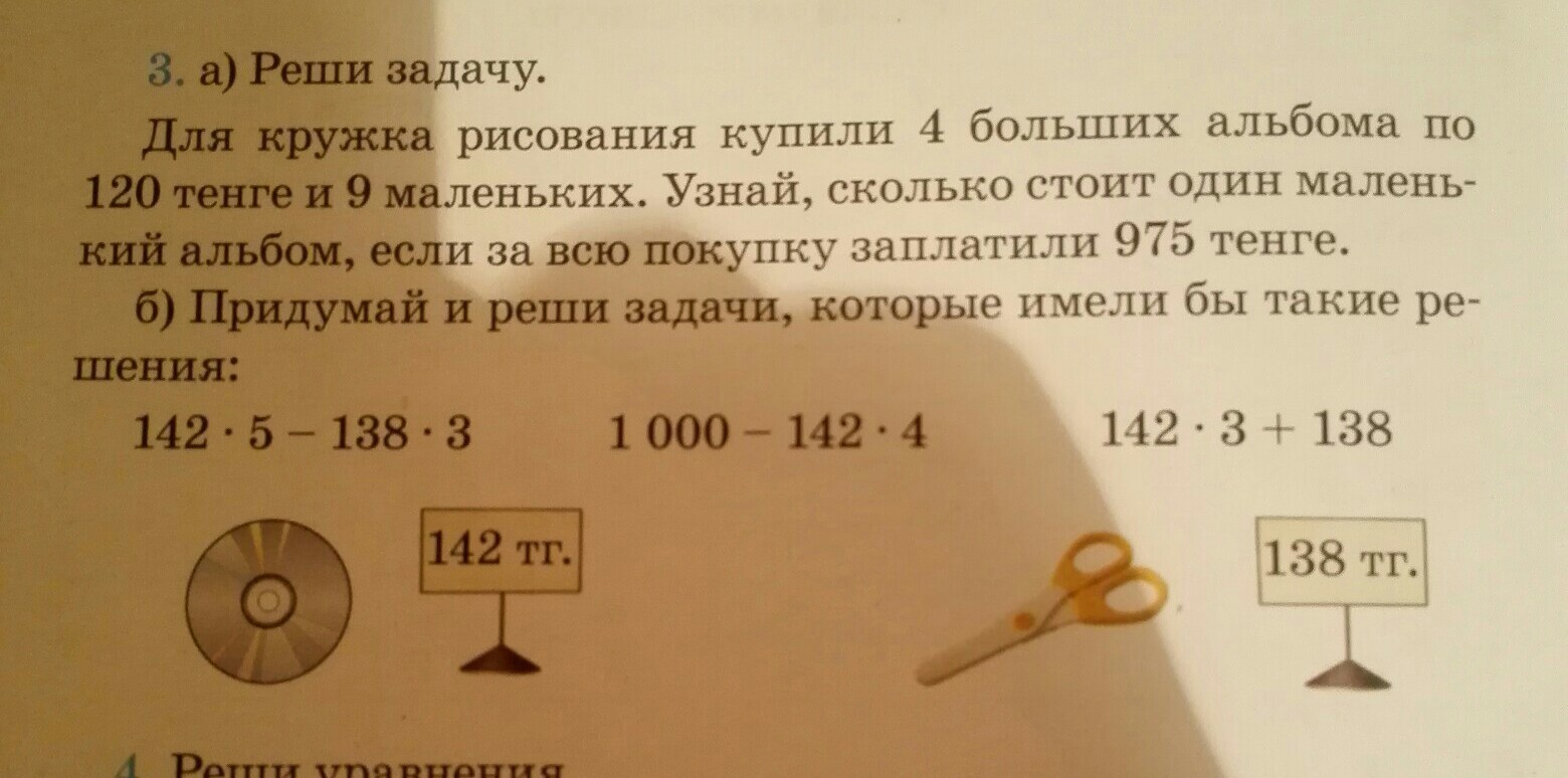 а)975-(4×120)=495 за маленькие 495÷9=55 один маленький альбом б)1)Витя купил 4 диска по 142 рубля. он решил поменять их на 3 ножниц по 138 рублей. сколько Вите вернут денег? 2)диск стоит 142 рубля. сколько дадут здачи от 1000 рублей если брать4 диска? 3)диск стоит 142 рубля, ножницы 138. сколоко стоят ножницы и 3 диска?