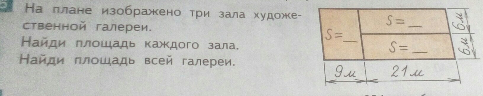 На плане изображено три зала художественной галерее. Найди площадь каждого зала. Найди площадь всей галереи.