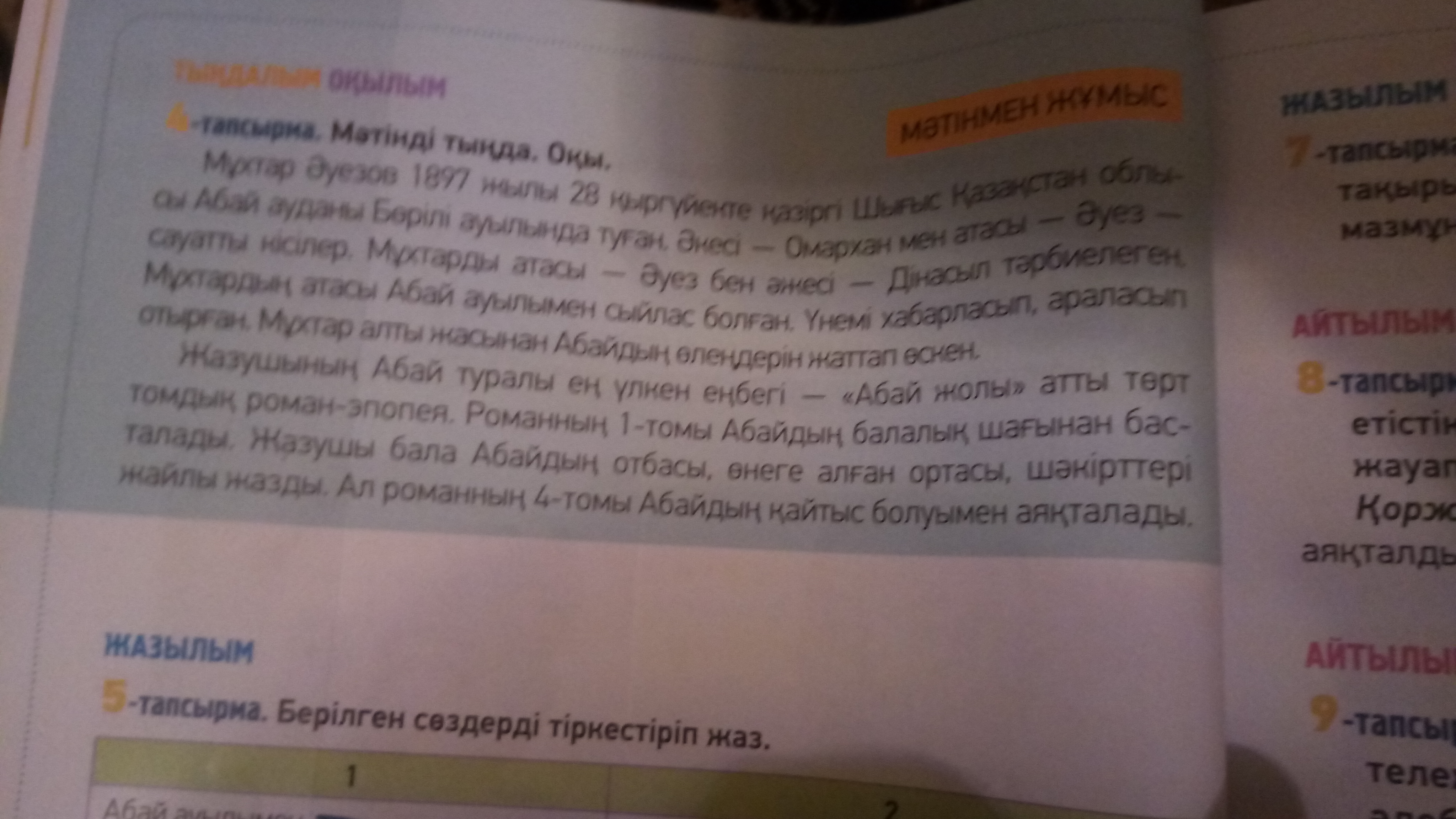 Мұхтар Әуезов қазіргі Шығыс Қазақстан облысы Абай ауданы Бөрілі ауылында туған.Ол қазақ халқының ұлы ақыны.Кішкентай кезінен Абай әуендерін сүйіп тындаған,тіпті Абайды көрген.Оның ең әйгілі жасған жұмысы "Абай Жолы" роман эпопеясы