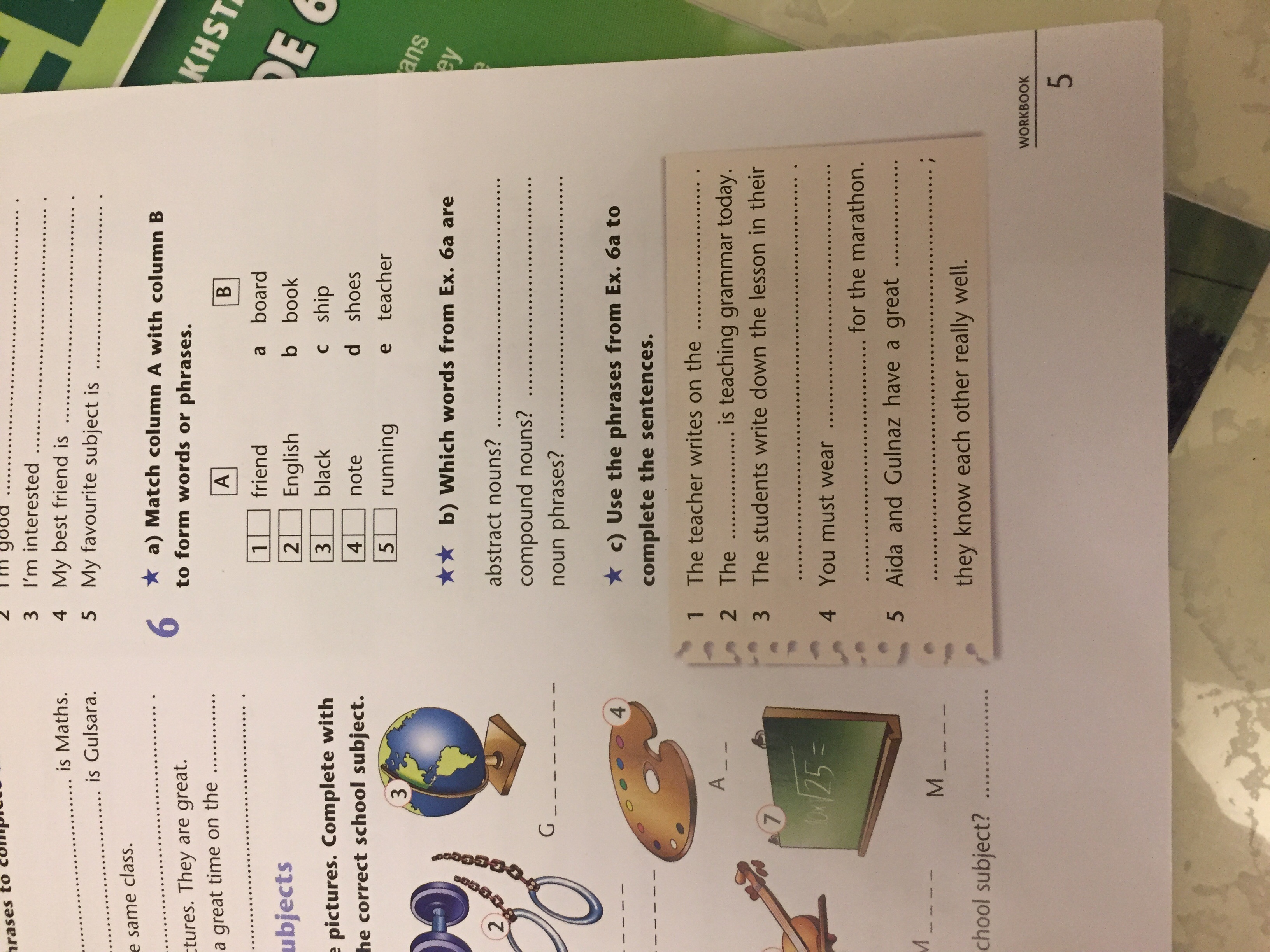 friend ship, English teacher, black board, note book, running shoes