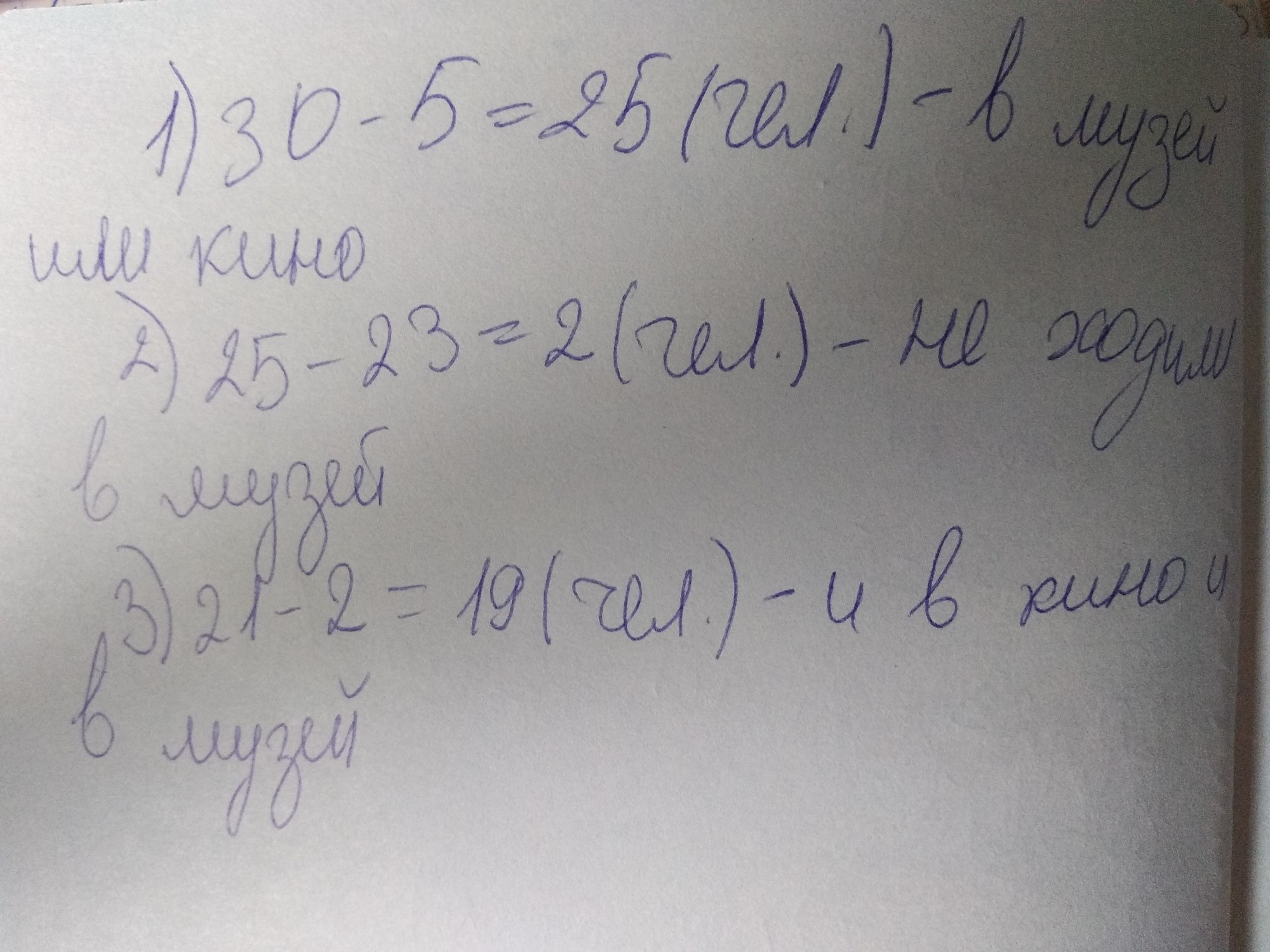 нашем классе 30 учащихся. На экскурсию в музей ходили 23 человека,в кино 21 человек,5 человек не ходили ни на экскурсию ни в кино. Сколько человек ходили и на экскурсию и в кино?