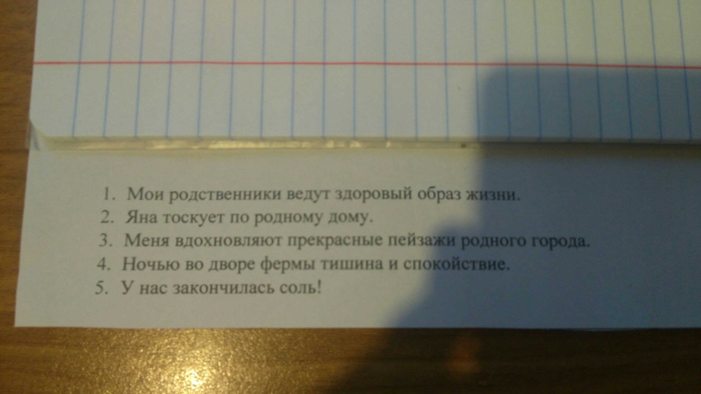 1)my relatives lead a healthy lifestyle. 2)Yana is homesick 3)Inspired by the beautiful scenery of my native city 4)at night in the yard of the farm there is peace and quiet 5)we ran out of salt