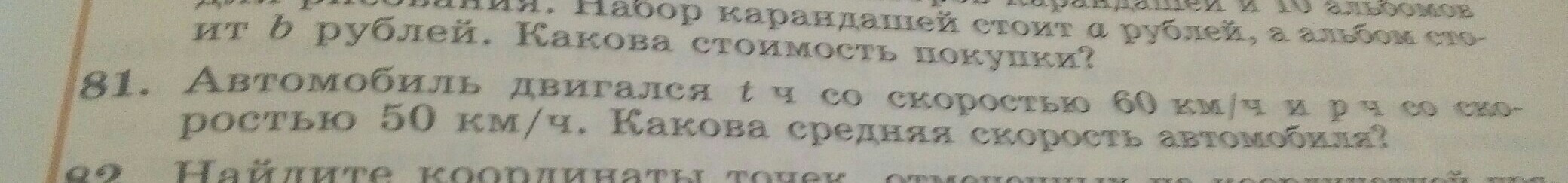 1)50+60=110( км/ч) 2)110:2=55(км/ч) - средняя скорость