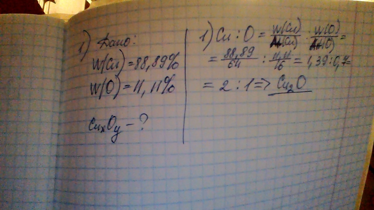 1) Найдите простейшую формулу оксида меди, содержащую 88,89 % сu