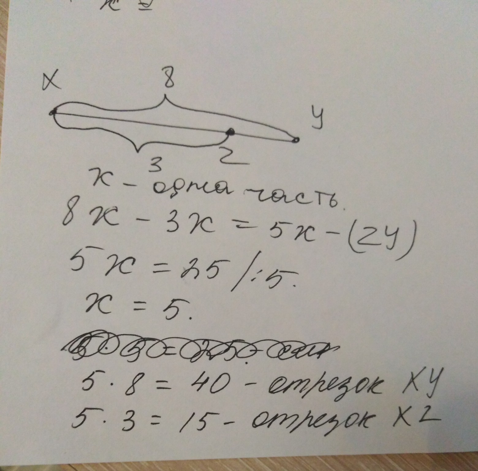 Точка Z делит отрезок XY на две части, в соотношениях XY : XZ = 8:3. Какая длинна отрезков XZ и XY, если ZY = 25 см