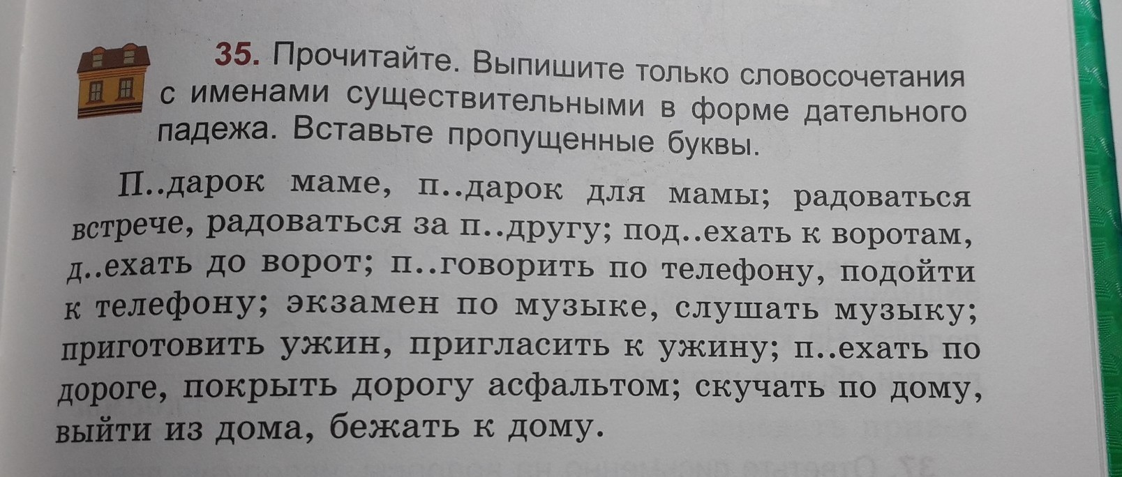 Подарок маме, радоваться встречи, подъехать к воротам, поговорить по телефону, подойти к телефону, экзамен по музыке, пригласить к ужину, поехать по дороге, спускать по дому, бежать к дому.