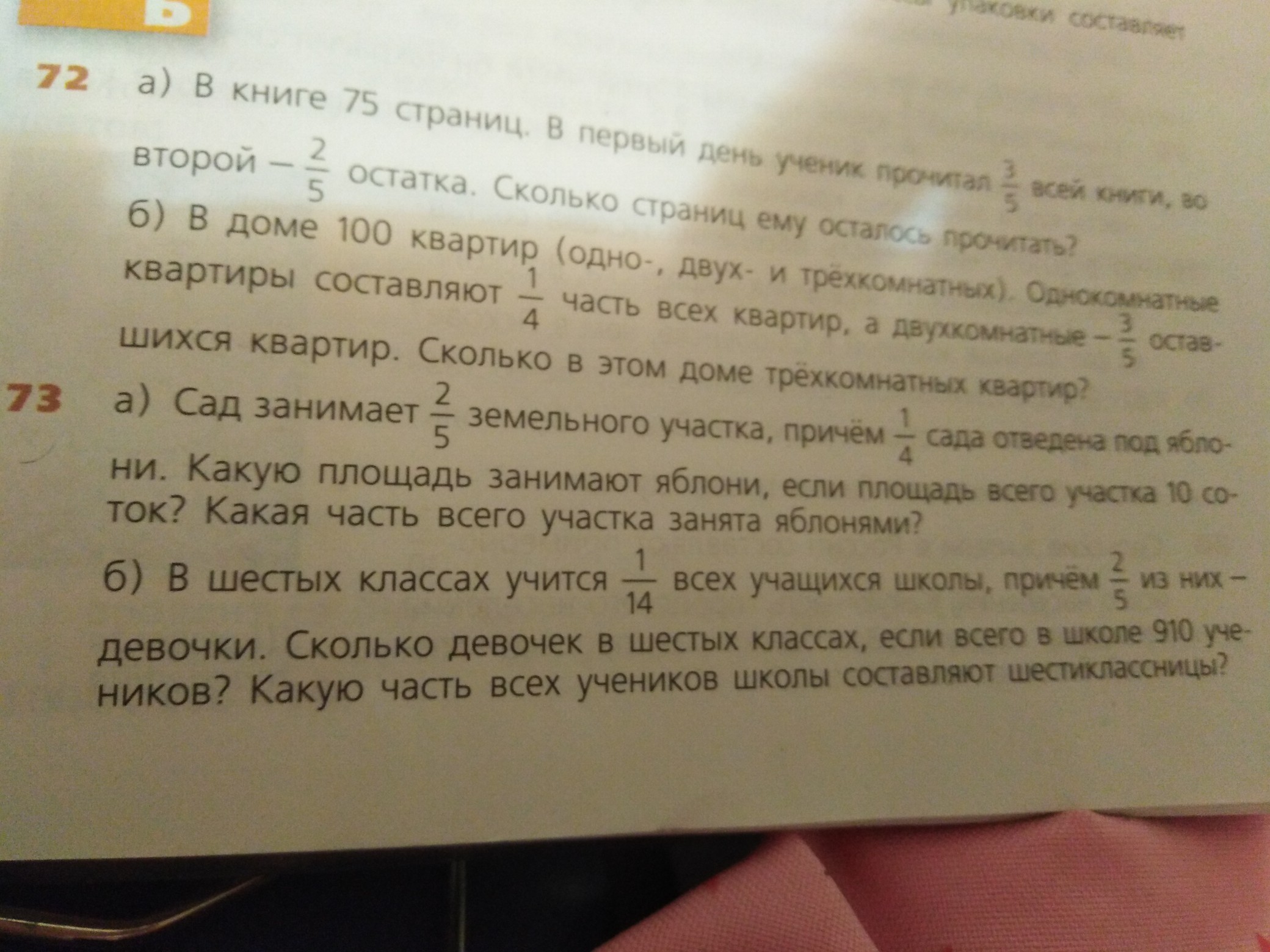 а) 1) 10*2/5=4 (сотки) - отведено под сад 2) 4*1/4=1 (сотка) - занимают яблони 3) 1:10=1/10 (часть) участка занята яблонями б) 1)910*1/14=65 (учеников) - учится в шестом классе 2) 65*2/5=26 (шестиклассников) - девочки 3) 35/910=1/35 (часть) - составляют шестиклассницы от всех учеников