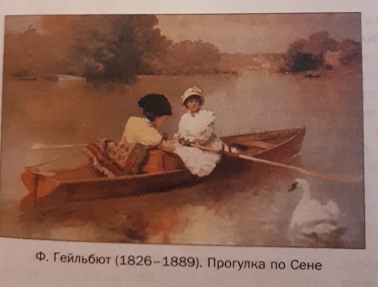 На данной картине изображена лодка, плывущая по реке Сена. В ней находятся молодая девушка и парень. Девушка одета в белое платье. Также, у неё есть красивая белая шляпка. Парень гребёт вёслами. Можно предположить, что они на свидании. На заднем плане изображены деревья. Фердинанд Гейльбют использовал тёплые тона красок, чтобы передать нам эту милую и романтично атмосферу. Автор картины использовал эти тона не случайно. Что может быть романтичный заката. Именно этими красками он смог передать закат и ту романтичную атмосферу, которую мы видим на этой красивой картине.