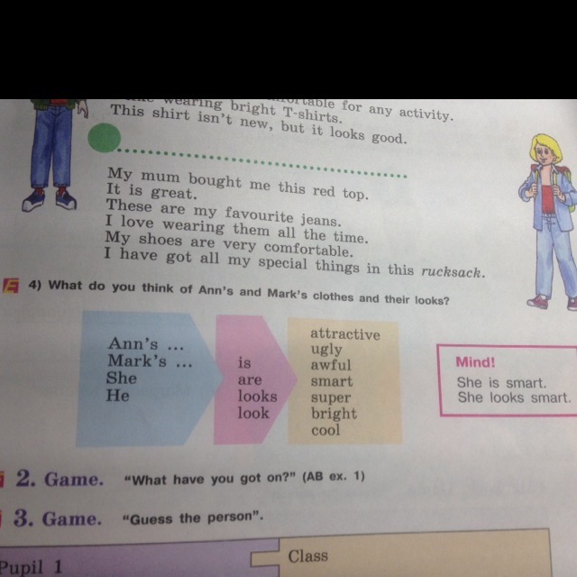 1. Mark's shoes are cool 2.Ann's jacket is smart 3. She looks bright 4. He looks awful