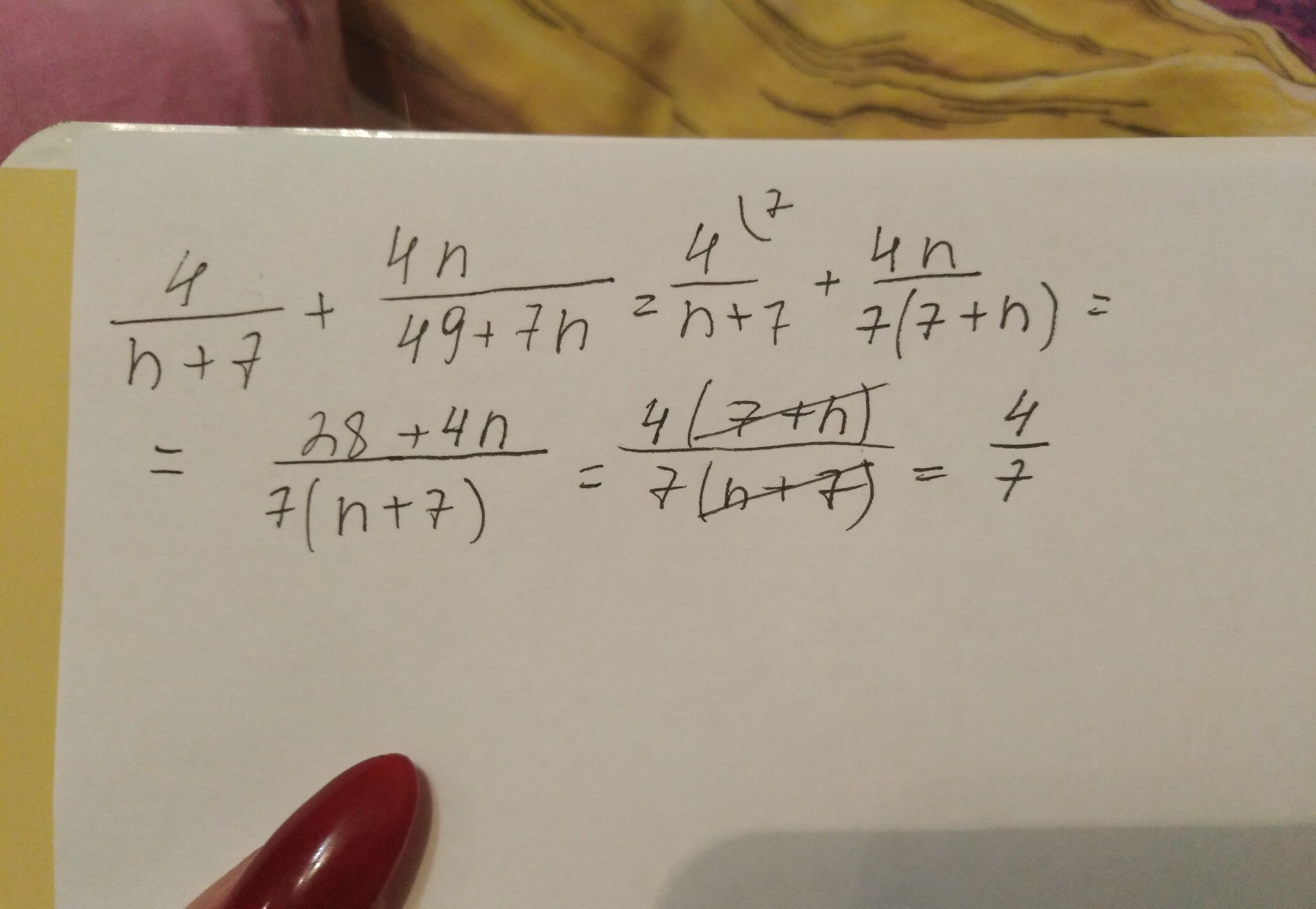 Выносим семь за скобки, домножаем первую дробь на семь, привели к общему знаменателю, выносим 4 за скобки, получились одинаковые скобки, сокращаем, получаем ответ