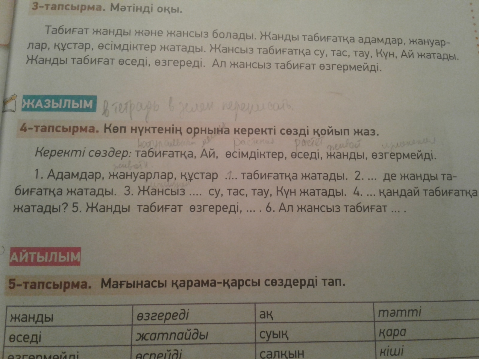 1.Адамдар жануарлар құстар жанды табиғатқа жатады. 2.Өсімдіктер де жанды табиғатқа жатады. 3.Жансыз табиғатқа су тас тау күн жатады. 4.Ай қандай табиғатқа жатады?. 5.Жанды табиғат өзгереді,өседі. 6.Ал жансыз табиғат өзгермейді.