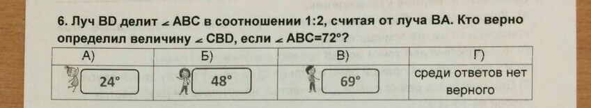 пусть k-коэффициент пропорциональности, тогда ∠ABD=k ∠CBD=2k ∠ABC=∠ABD+∠CBD k+2k=72° 3k=72° k=24°, значит ∠CBD=2·24=48° отв.Б