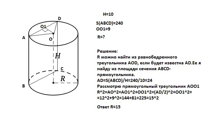 2)Высота цилиндра равна 10 дм. Площадь сечения цилиндра плос¬костью, параллельной оси цилиндра и удаленной на 9 дм от нее, равна 240 дм2. Найдите радиус цилиндра.