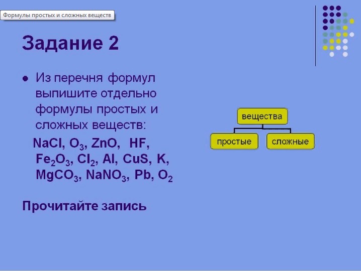 Простые:О3, CI2, Al, K, Pb, O2. Сложные:NaCI, ZnO, HF, Fe2O3, CuS, MgCO3, NaNO3.