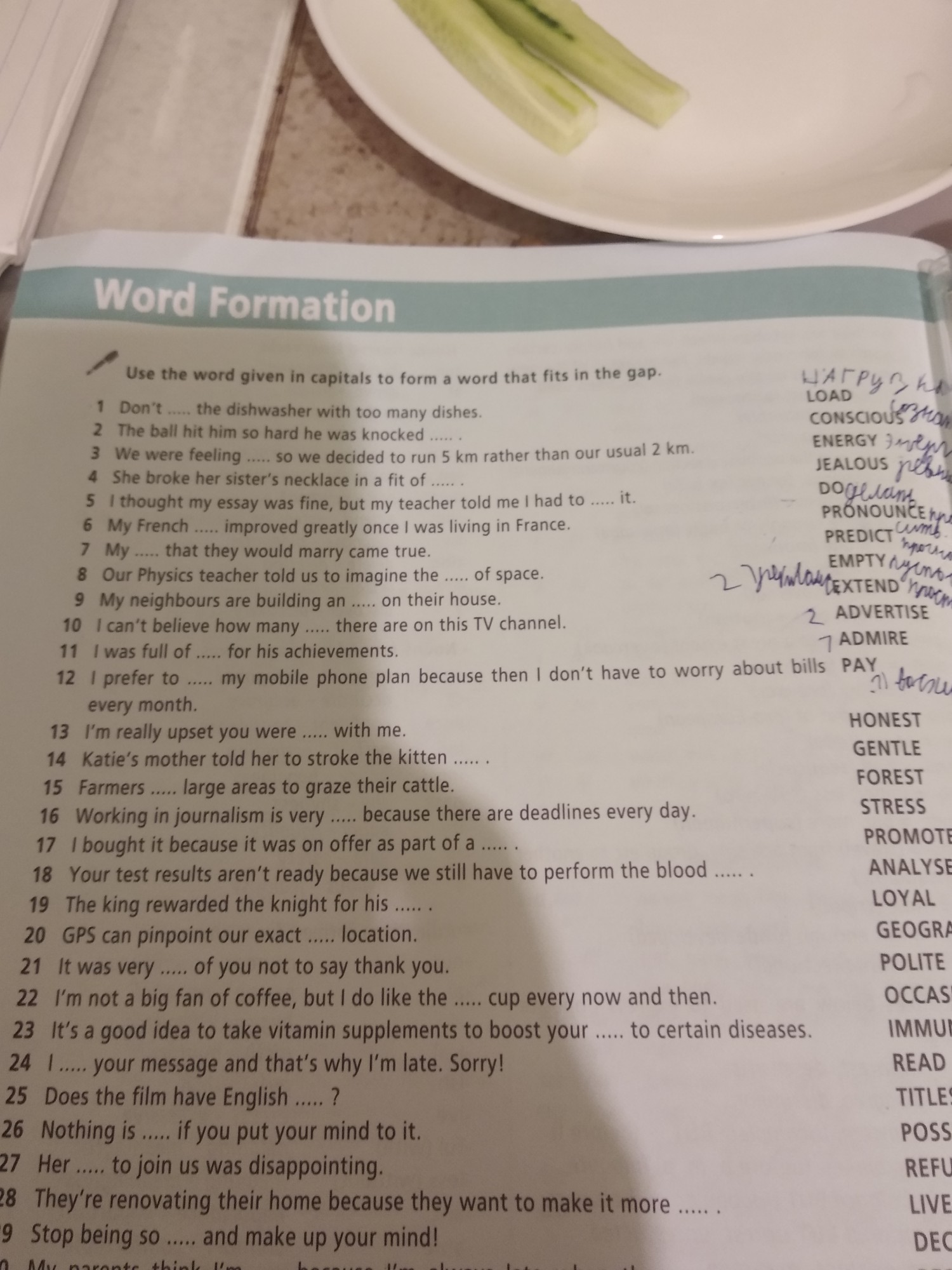 1.load 2.consciously 3.energetic 4.jealousy 5.do 6.pronounciation 7.prediction is (может быть) 8.emptiness 9.не знаю точно 10.advertisements 11.admiration 12.pay 13.dishonest 14.gently 15.forested 16.stressful 17.promotion 18.analyses 19.lorally 20.geographic 21.impolite 22.occasional 23.immunity 24.was reading 26.subtitles 27.impossible 28.reflection