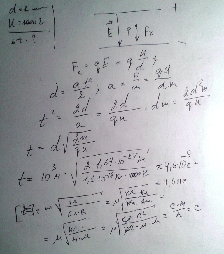 Протон перебуває між пластинами конденсатора, відстань між якими 1мм.Напруга на пластинах конденсатора 1000В. За який час частинка подолає відстань між пластинами рухаючись вздовж силової лінії у вакуумі