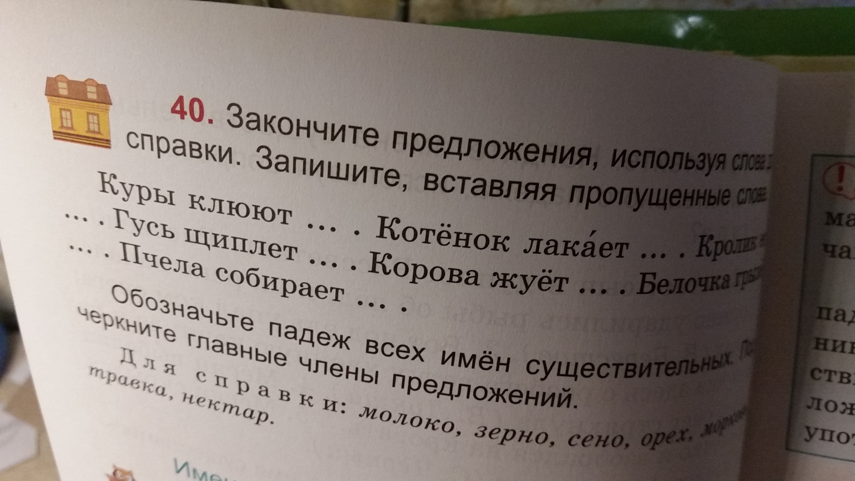 1)Зерно 2) молоко 3)морковь 4)трава 5)сено 6)орех 7) нектар Куры - сущ (и.п) (одной чертой) клюют - глагол (двумя чертами) Кролик- сущ (и.п) ест -глагол Котенок - сущ (и.п) лакает- глагол Гусь сущ и.п щиплет глагол Корова сущ и.п жует глагол Белочка сущ и.п грызет глагол Пчела сущ и.п собирает глагол