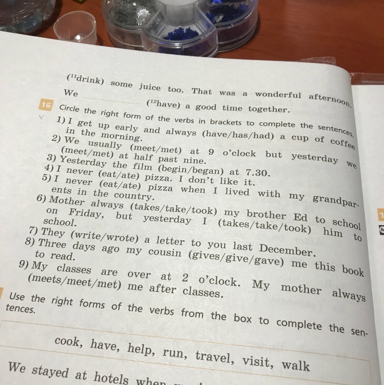 1 have 2 meet, met 3 began 4 eat 5 ate 6 takes, took 7 wrote 8 gave 9 meets