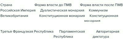 Составьте таблицу "политические режимы индустриальных стран в первые десятилетия xx века",используя следующие графы:страна, формы государственной власти до первой мировой войны и после мировой войны