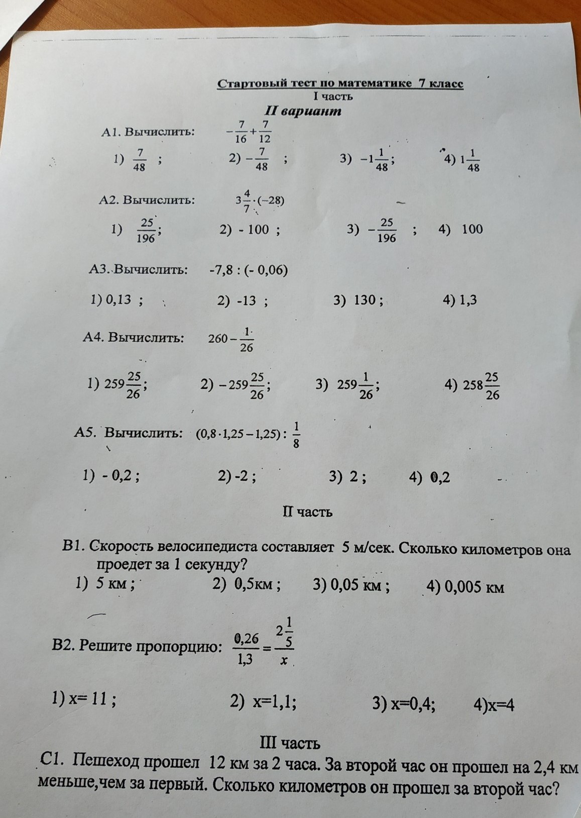 А1. - 7/16 +7/12=-21/48+28/48=7/48 А2. 3 ⁴/7 ×(-28)=25/7 ×(-28/1)=-100 А3. - 7,8:(-0.06)=78/100×100/6=130 А4. 260-1/26=259 25/26 А5. (0,8×1,25-1,25):1/8+1,25(0,8-1)×8=-2 В1. 5м/сек = 0, 005км/сек В2. 0,26/1.3=2 1/5/x x=(13/10 ×11/5)/26/100=11