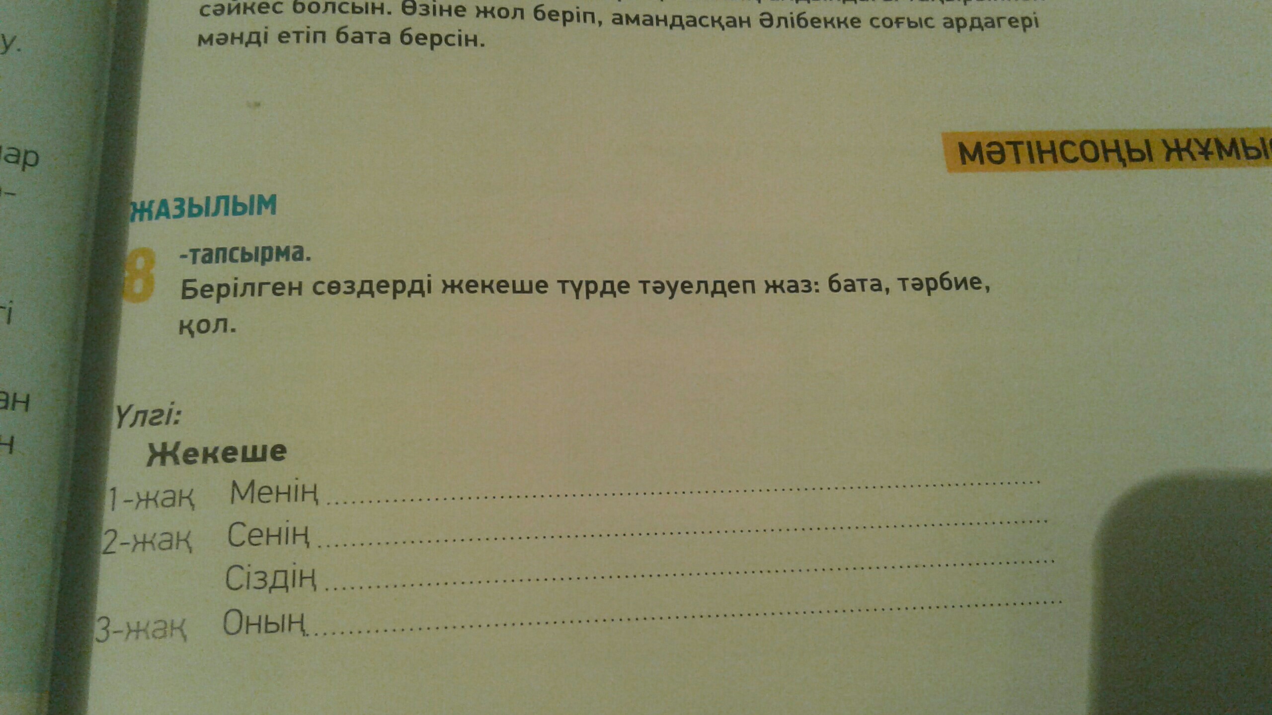 Менин батам, тарбием, колым Сенин батан, тарбиен, колын, Сиздин батаныз, тарбиениз, колыныз, Онын батасы, тарбиеси, колы