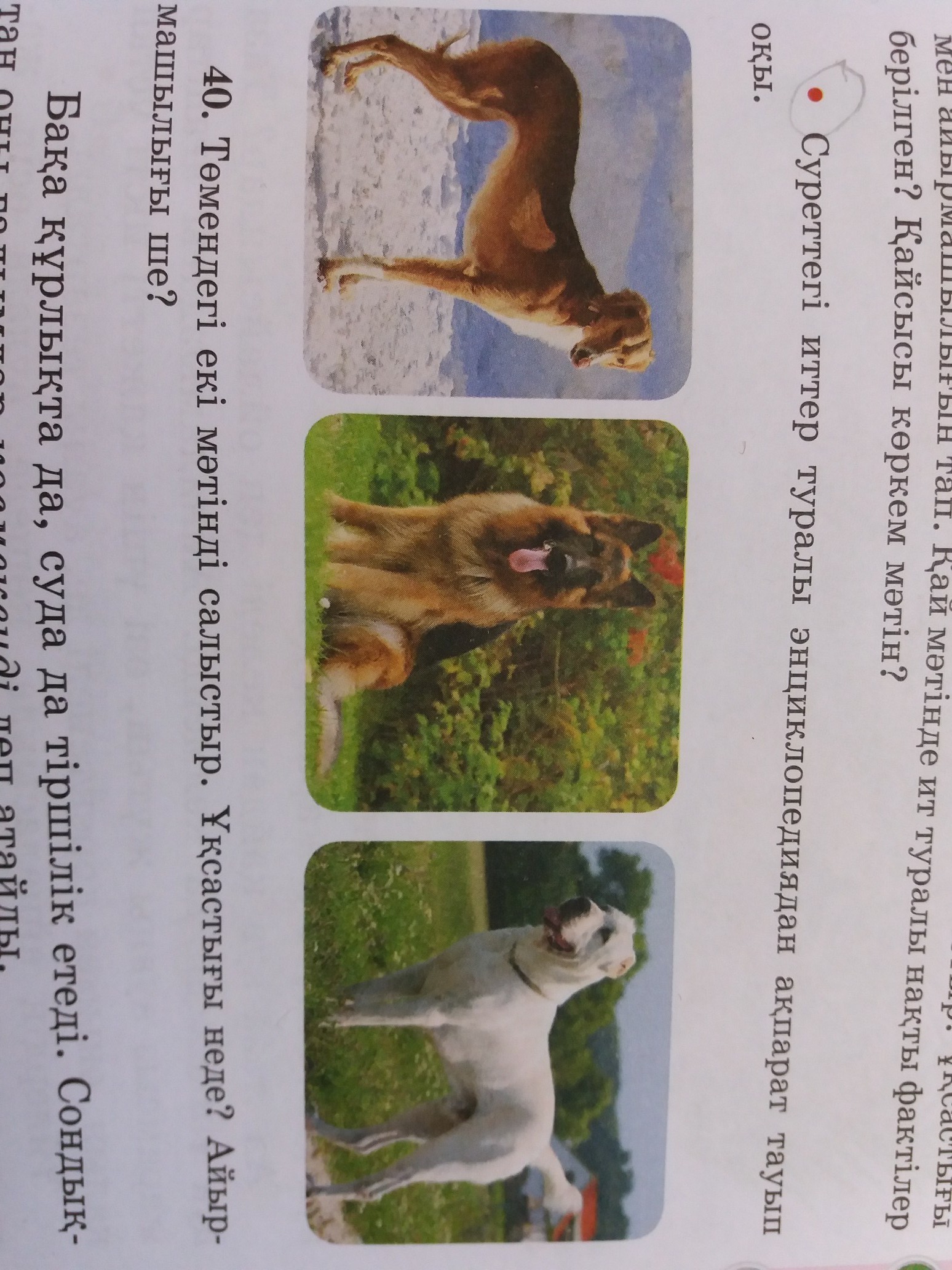 Тазы, тазы итін қазақ халқы аңға алып шыққан, себебі тазы иті өте тез жүгіретін болған.Овчарка, овчарканы полицейлер қолданған, себебі ол ит өте ақылды және шыдамды болған.Алабай итін үй күзетке қойған себе алабай өте күшті болған