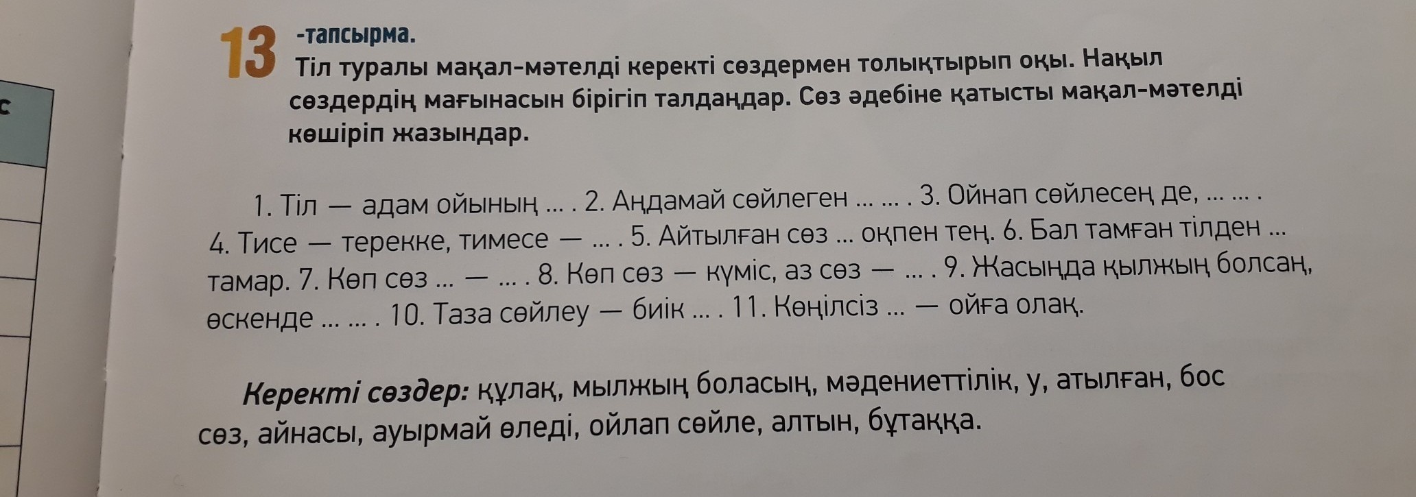 6. Бал тамған тілден У да тамар. 7. Көп сөз, боқ сөз. 8. Көп сөз - күміс, аз сөз - алтын. 9. Жасында қылжың болса, өскенде мылжың боласын.