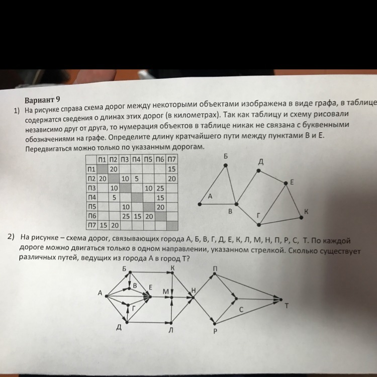 1) Пункт Г − единственный пункт с тремя дорогами, значит ему соответствует П2, а пункт Е − единственный с четырьмя дорогами, значит ему соответствует П4.